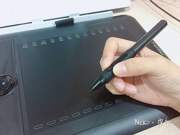 筆輕,拿起來一點都不負擔很順手,還能一鍵轉換或用筆的尾端當橡皮擦唷!畫畫手勢要避開按到按鍵,所以我都是這樣拿的,一開始難免會按到,很快就習慣了