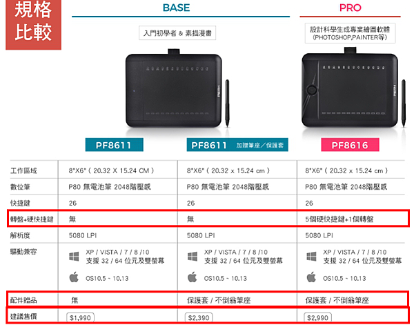 目前提供的三種方案感壓筆和繪圖板規格都一樣